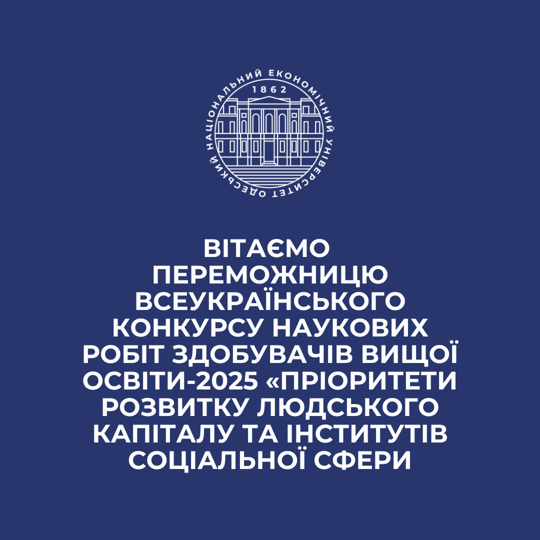 Здобувачка, Панченко Софія, 23 групи кафедри управління персоналом і економіки праці ФЕУП посіла ІІ місце у Всеукраїнському конкурсі наукових робіт здобувачів вищої освіти-2025 «Пріоритети розвитку людського капіталу та інститутів соціальної сфери», який проводився на базі Київського національного економічного університету імені Вадима Гетьмана.