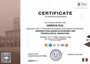 Кандидат економічних наук, доцент кафедри Сорока Олександра Володимирівна та студентка 4 курсу ЦЗВФН Гержик Дар’я прийняли участь у 1st International Scientific and Practical Conference «Modern Challenges in Economic and Technological Innovation», що відбулася 15–17 жовтня 2025 року в Болоньї (Італія).