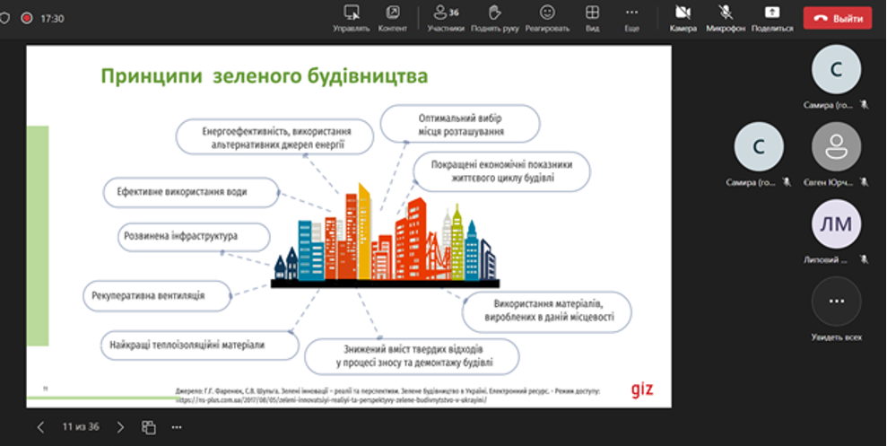 У ході дискусії студенти дізнались про сталий розвиток будівництва, принципи зелёного будівництва, принципи здорової будівлі та існуючі сертифікації зелених будівель.